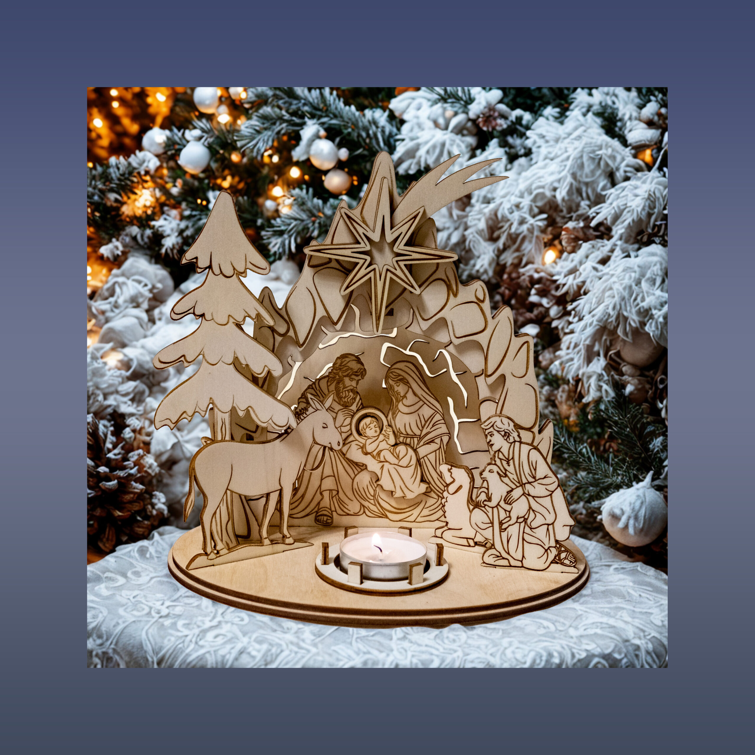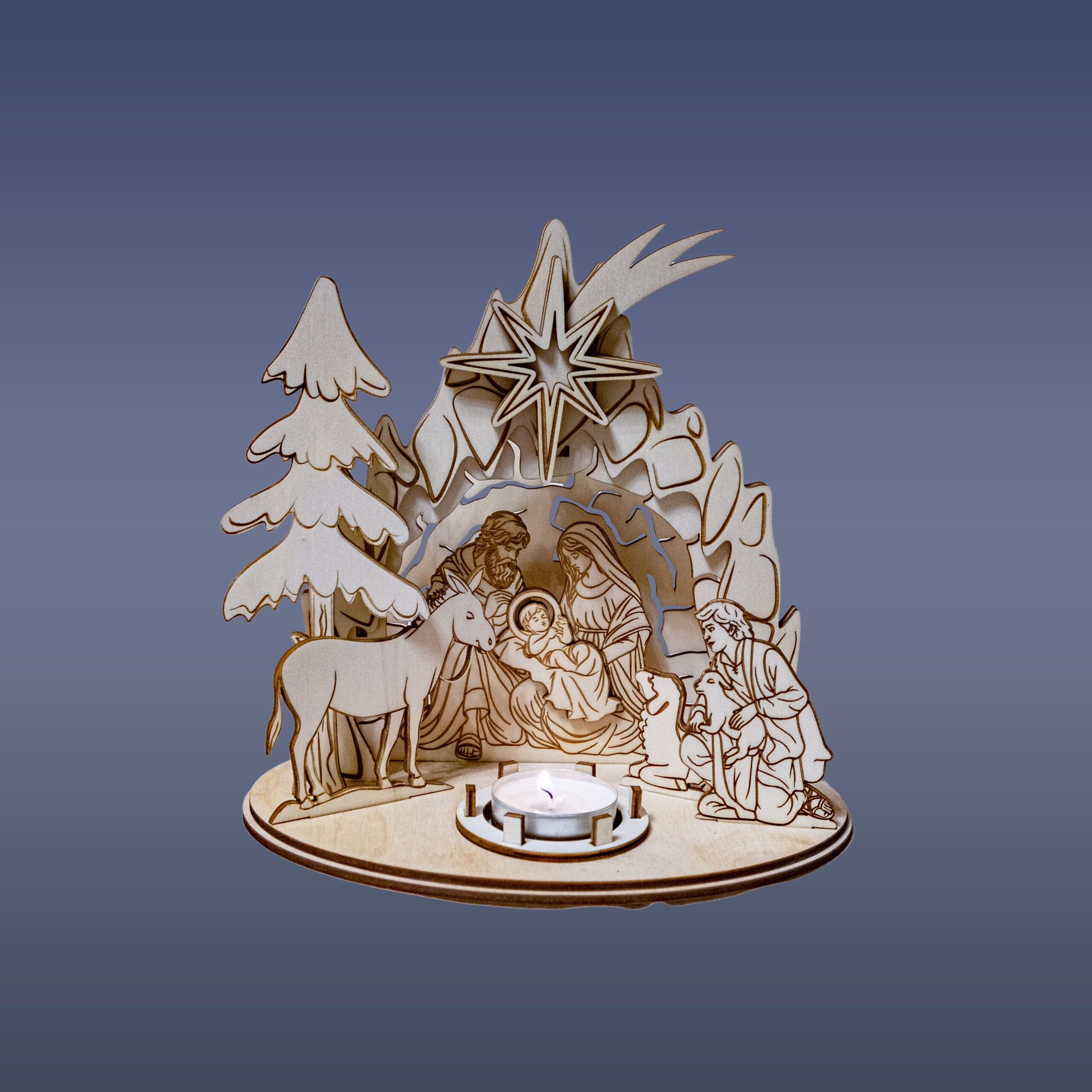 Tento drevený betlehem s miestom pre čajovú sviečku – jemný vzor, je vyrobený z preglejky, jemne brúsenej pre hladký povrch. Celková výška je približne 190cm, šírka 185cm, čo z neho robí výrazný, no nie prehnane veľký dekoratívny prvok na váš sviatočný stôl alebo poličku.